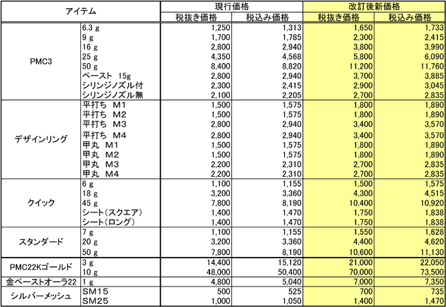 2月に価格変更を行ないましたPMCですが、その後も銀の地金は高騰を続けており、3月より新たな販売価格ゾーンに変動することとなってしまいました。 3月からは、銀山元建値ゾーン58001円〜68000円のゾーン(お渡ししているPMC販売価格一覧表の茶色のゾーン)が新たな、受講生、インストラクター、講師の方への販売価格となります。 ご不明な点がありましたら、シルバークレイアカデミー本部まで、お問い合わせ下さい。
